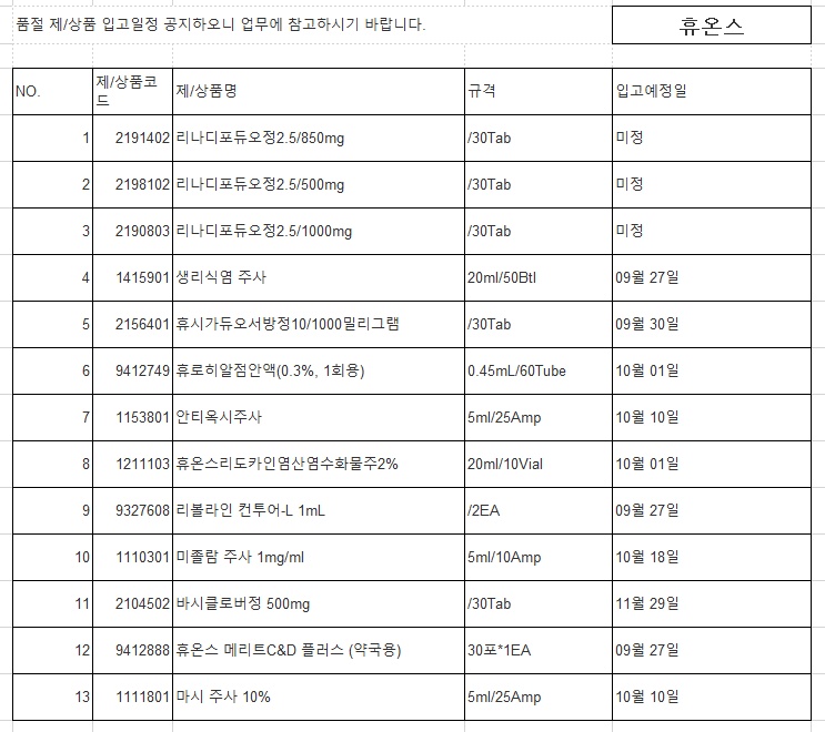 품절 공지(휴온스제약)